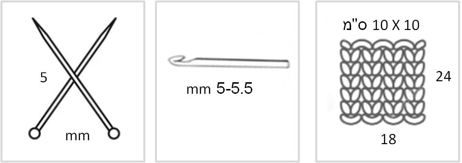 מסרגות וקנה מידה: ריבוע 10*10 ס"מ= בשתי מסרגות: 18 תכים ו- 24 שורות; במסרגה אחת: 14 תכים ו-16 שורות