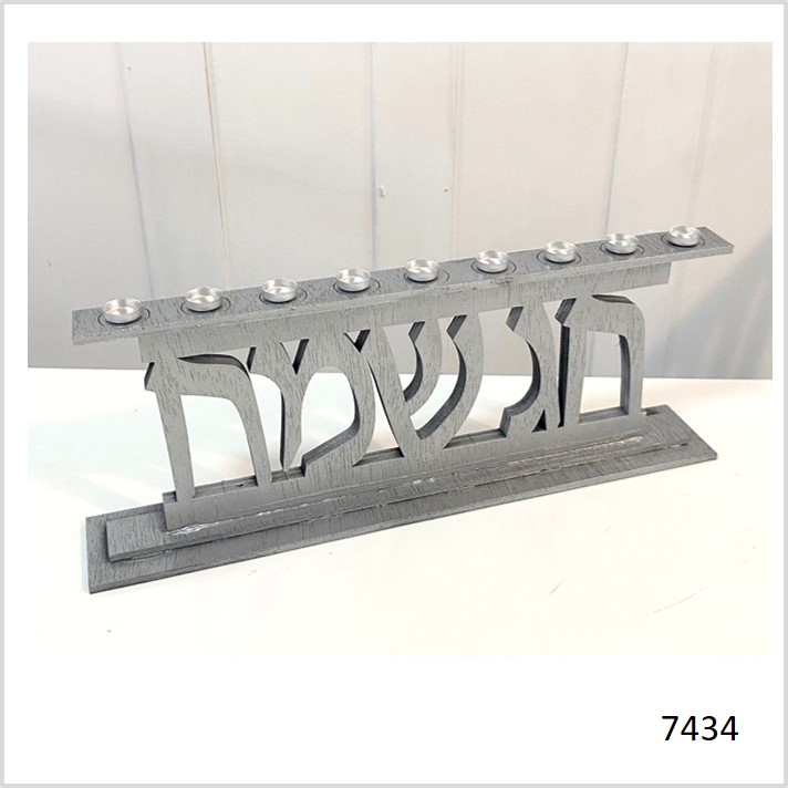 חנוכיה מעץ בחיתוך לייזר- דגם חג שמח שחור/ כסוף