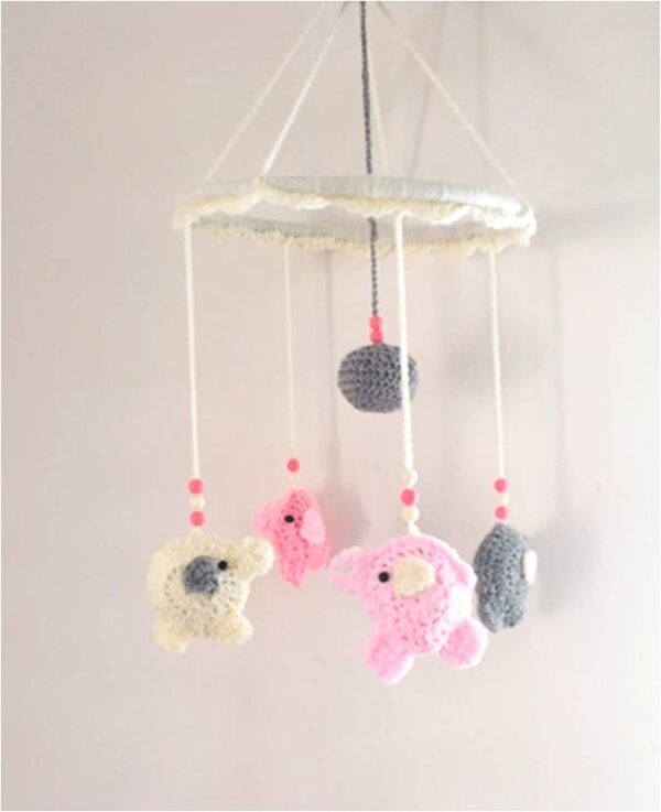 מובייל לחדרי תינוקות דגם פילים ורודים, נסרג בעבודת יד מחוטים איכותיים. משדרג כל חדר תינוקות