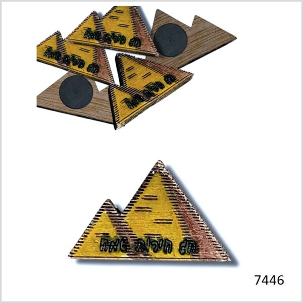מגנט למקרר עשוי מעץ בחיתוך לייזר בצורת פירמידות ובכיתוב חג חירות שמח